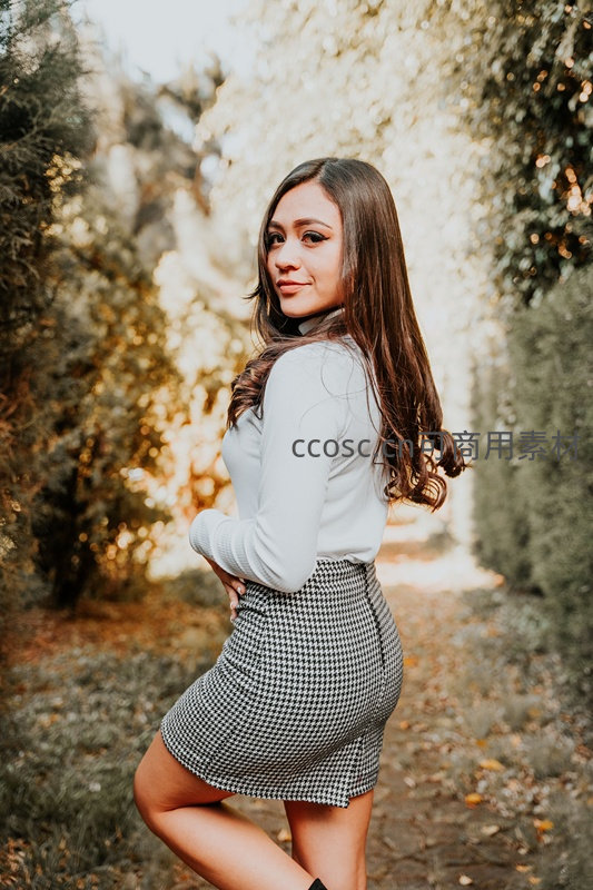 一位长发女子身着白色上衣与黑白格纹短裙,在秋日树林小径中回眸浅笑,柔和的阳光穿过树叶洒落,营造出温暖而宁静的氛围。