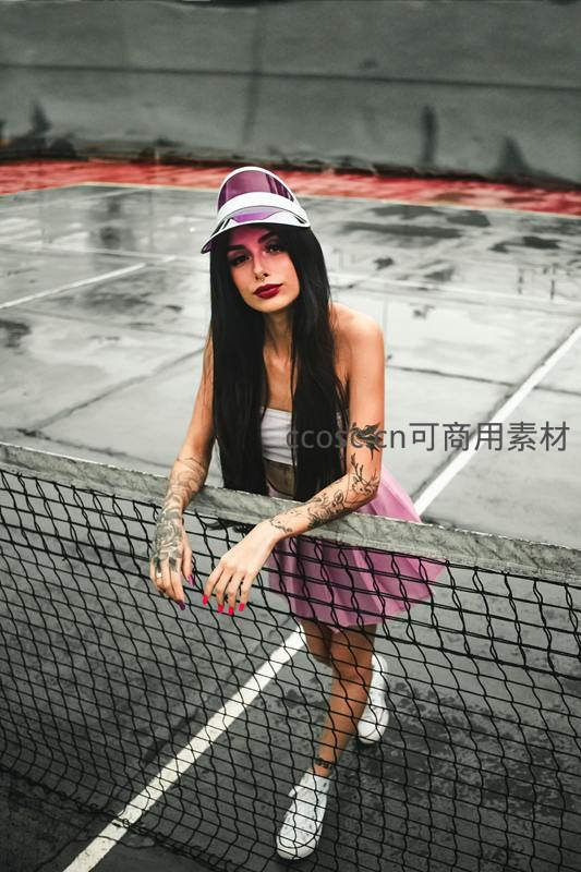 一位拥有纹身的女子戴着紫色遮阳帽,身穿粉色短裙与白色运动鞋,倚靠在湿漉漉的网球场边,展现出力量与柔美的独特结合。