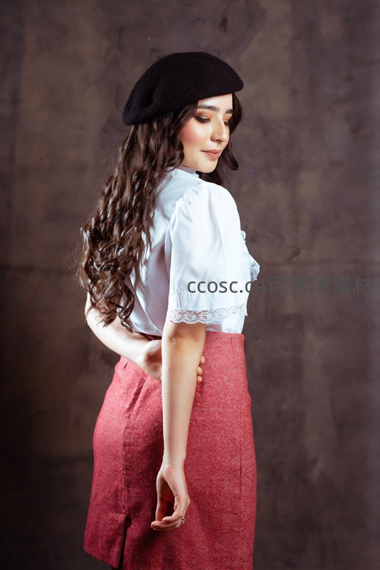 女子头戴黑色贝雷帽,长卷发垂落肩头,身穿白色蕾丝袖口衬衫与红色高腰半裙,侧身回眸,神情温柔恬静,尽显经典法式优雅与复古韵味。