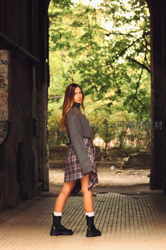 一位身穿灰色高领毛衣和不对称格纹短裙的女孩站在老式巷道口,回头凝视镜头,脚踩黑色厚底靴,背景是斑驳墙面与绿树光影。