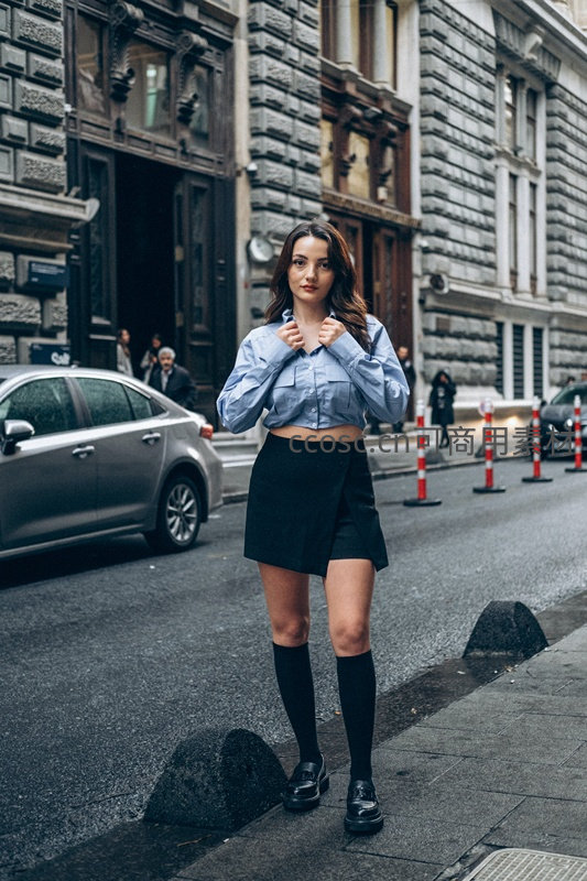 一位年轻女性站在欧洲风格的城市街道上,身着浅蓝短衬衫与黑色高腰短裙,搭配黑色长袜与皮鞋,展现出都市摩登的时尚感。
