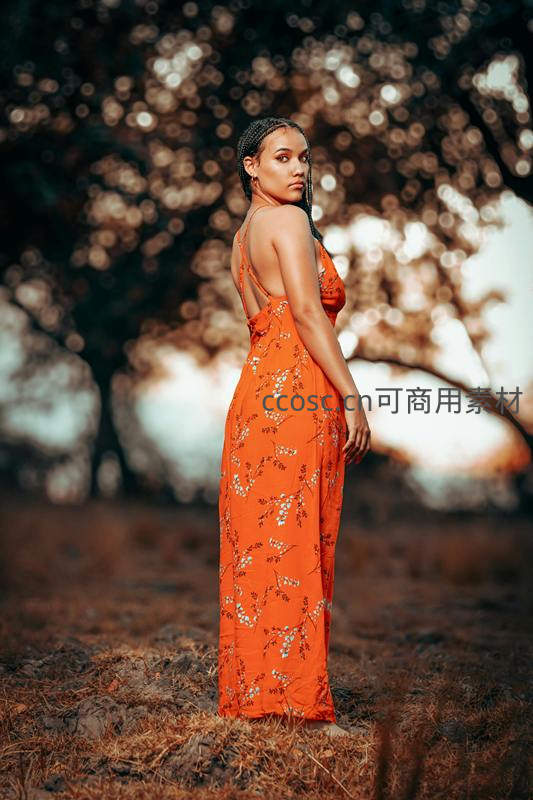橙色长裙女子回眸林中剪影