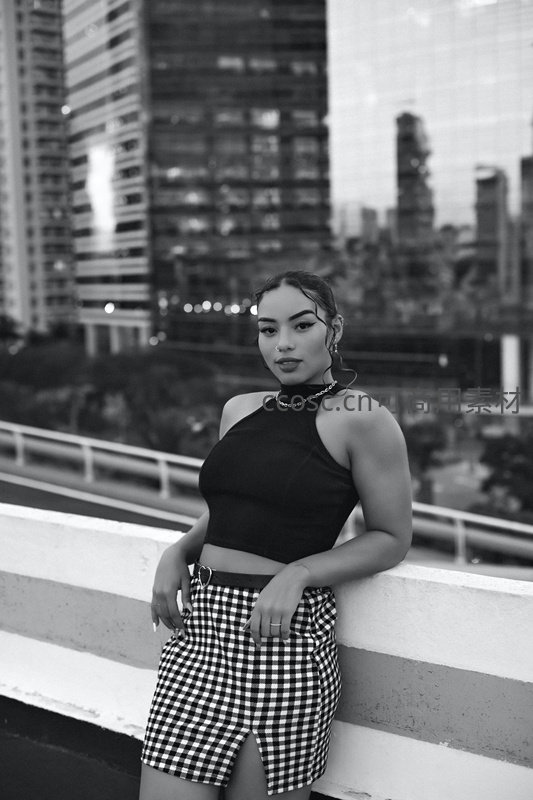 在摩登都市高楼背景下,一位穿着格子短裙的女性倚靠栏杆,黑白影像强化了画面的质感与时尚氛围,尽显都市魅力。
