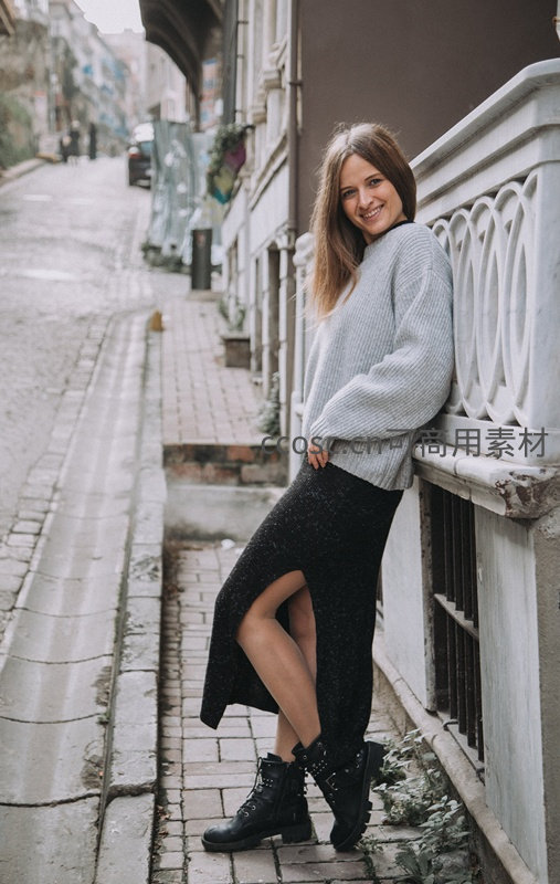 女子身穿灰色毛衣与黑色开衩长裙,脚踩马丁靴,倚靠在欧式建筑的栏杆旁,对着镜头绽放灿烂笑容,充满都市时尚感。