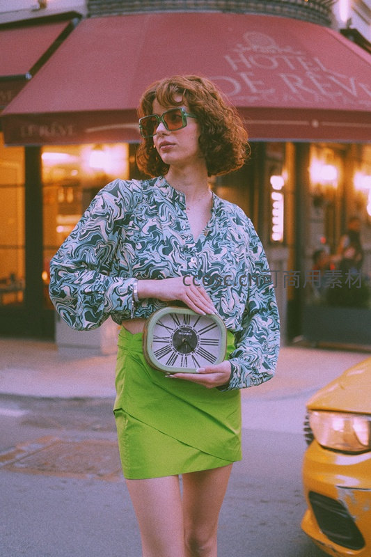 卷发女子身着波纹衬衫和亮绿短裙,手持复古时钟包,站在酒店门前,阳光洒落,营造出浓郁的70年代街头时尚氛围。