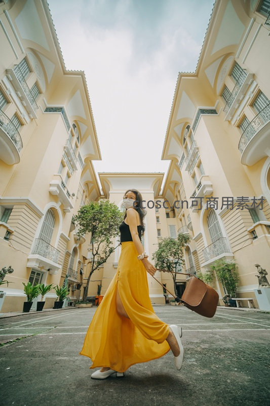一位身着飘逸黄裙的女子在米色欧式建筑庭院中轻盈行走,阳光洒落,氛围宁静而浪漫,展现都市生活中的优雅瞬间。