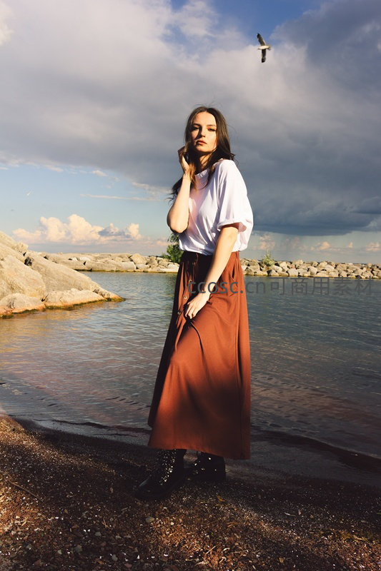 女子身穿白色上衣与棕色长裙,伫立在水边岩石旁,手抚发丝,目光深邃,空中飞鸟掠过,天空云卷云舒,充满诗意氛围。