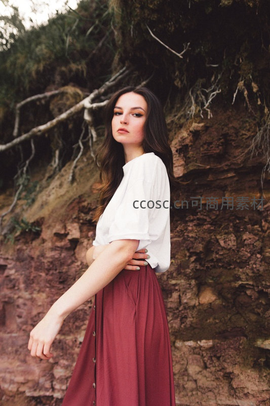在布满苔藓的土黄色岩壁前,一位穿白色短袖上衣与酒红色长裙的女子侧身站立,回眸凝视镜头,神情沉静而富有故事感。