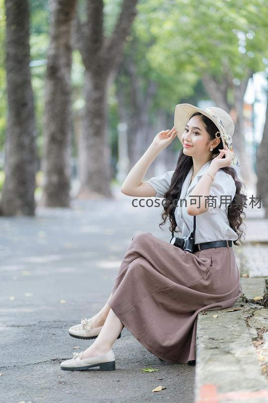 一位穿着米色衬衫与棕色长裙的女子坐在路边石阶上,手扶草帽,笑容恬静。背景是绿树成荫的街道,充满悠闲的都市生活气息。