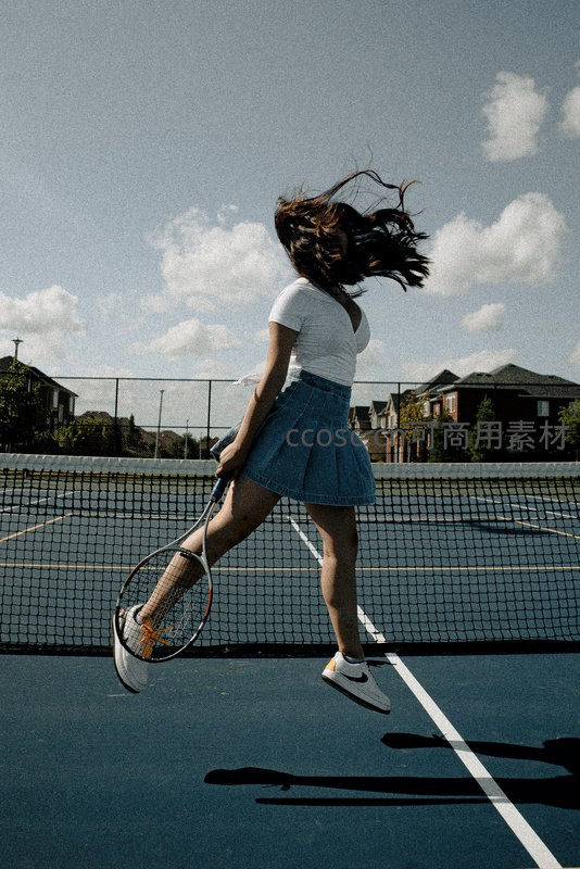 女孩在户外网球场奋力跃起挥拍击球,深蓝色球场与蓝天白云形成对比,飞扬的发丝和清晰的影子定格了运动的爆发力与青春活力。
