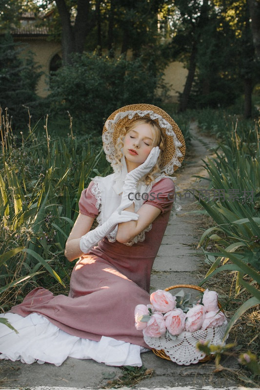 身着维多利亚风格服饰的女子坐在石径旁,头戴蕾丝边草帽,手捧花篮,闭目享受午后阳光的温柔时刻。
