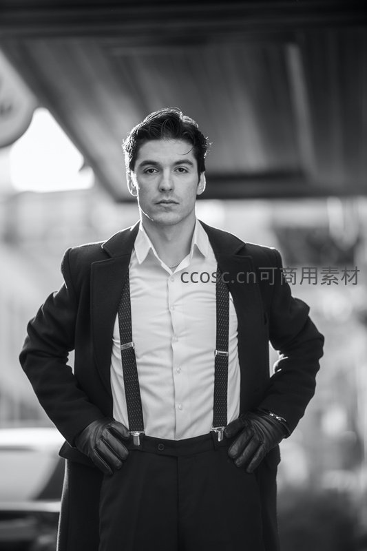 黑白影像下,一位男士身着正装搭配吊带裤和皮手套,双手叉腰直视镜头,展现出经典而沉稳的绅士魅力与强烈视觉冲击力。