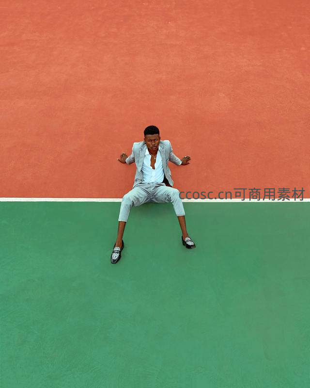 从高空俯瞰,一名男子坐在红绿相间的网球场中央,身穿浅灰西装与白色衬衫,姿态放松而富有设计感,形成强烈的色彩与构图对比。