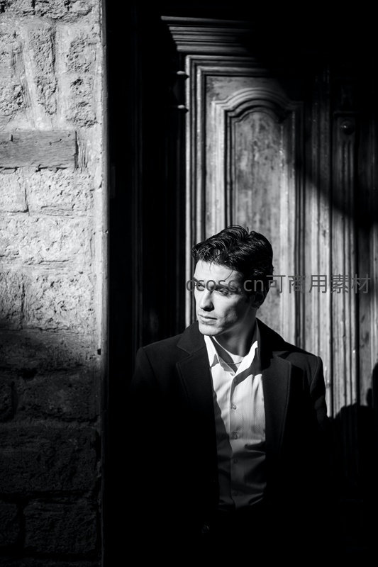 一位身着西装的男士伫立在斑驳石墙与古旧木门前,强烈的明暗对比勾勒出他深邃的轮廓,营造出充满故事感的电影氛围。