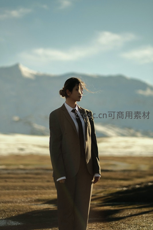 一位穿着棕色西装的女子独自站在广袤的高原草地上,身后是连绵的雪山,柔和的逆光勾勒出她的剪影,传递出一种孤寂而壮美的意境。