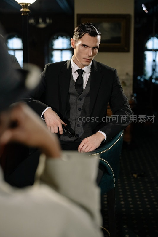 男子身着三件套黑色西装,坐在墨绿色丝绒扶手椅上,手中握枪,眼神锐利,摄影师正在拍摄,营造出电影感十足的复古悬疑氛围。
