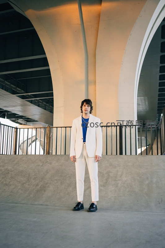 一位身穿白色西装的青年站立在混凝土拱形结构前,柔和光线勾勒出建筑线条,展现都市现代美学与人物沉静气质。