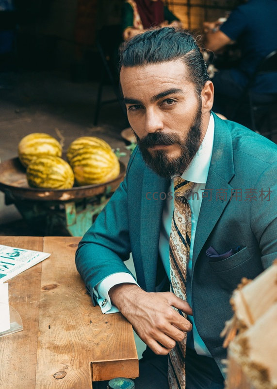 一位蓄着浓密胡须的绅士身穿蓝绿色西装,在充满生活气息的市集木桌前凝视镜头,背景的西瓜增添了一丝悠闲的市井风情。