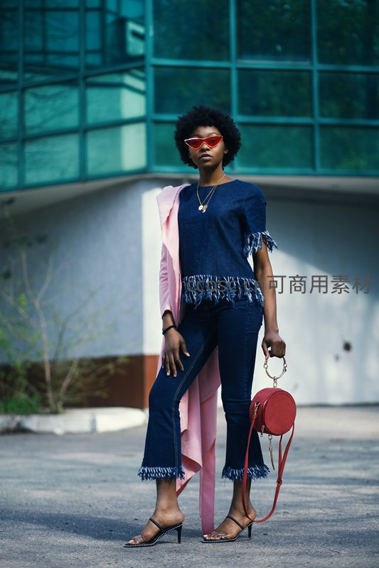 时尚黑人女性街拍,牛仔套装配粉色外套