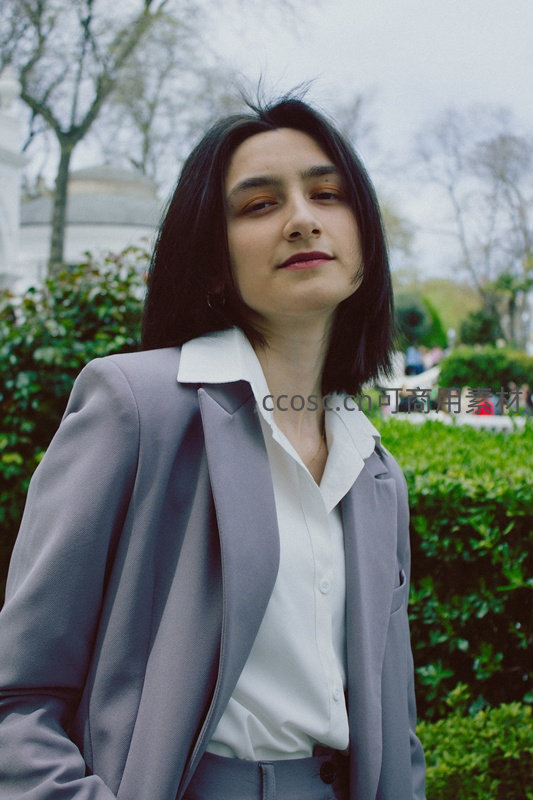 一位留着黑色短发的女性身穿灰色西装与白色衬衫,在公园绿篱前拍摄肖像。柔和的自然光映衬其沉静神情,背景中模糊的树木与行人营造出宁静而文艺的氛围。
