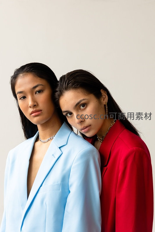两位女性身着蓝红撞色西装,姿态亲密,神情自信,背景纯净,凸显现代时尚与个性魅力。