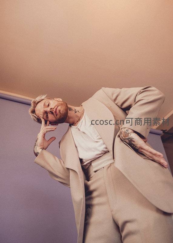 一位金发带胡须的男子身穿米色西装,斜躺在紫色沙发上,手臂纹身清晰可见,眼神迷离,展现慵懒又时髦的风格。