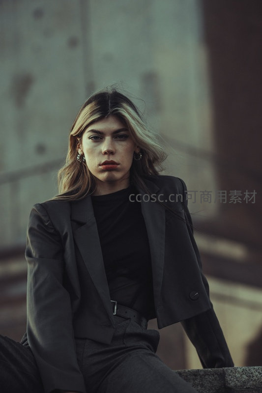 一位神情冷峻的金发女子身穿黑色西装套装,坐在城市街头的台阶上,耳环精致,整体造型干练又充满现代感。