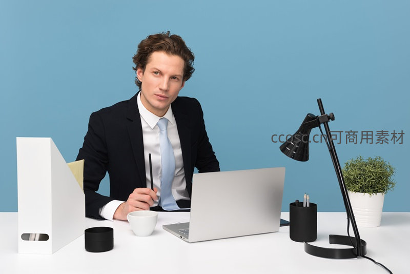 一位穿着深色西装的商务男士坐在整洁的白色办公桌前,手握笔注视前方,桌上摆放着笔记本电脑、台灯和绿植,背景为纯净蓝色墙面。