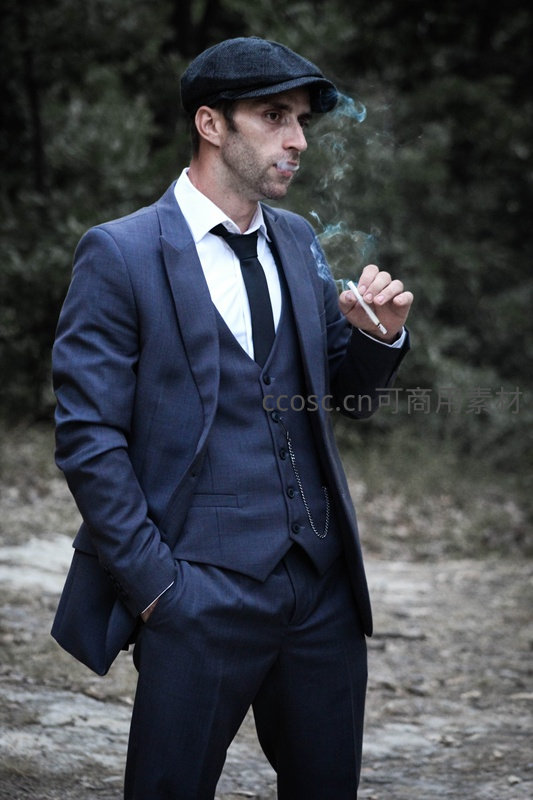 身着深色三件套西装的男士头戴报童帽,在林间小径上点燃香烟,神情专注而略带忧郁,营造出浓郁的复古电影氛围。