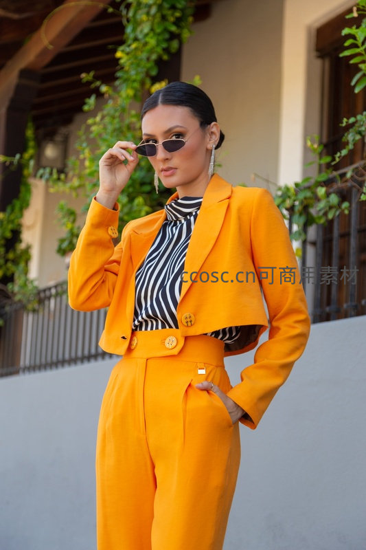一位女性身着亮眼橙色短款西装与高腰裤,内搭黑白条纹衫,手扶墨镜,姿态自信,展现街头潮流与干练气质。