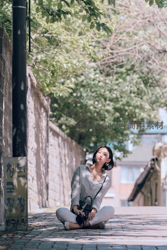 一位年轻女性盘腿坐在铺满阳光的石板街道上,怀抱相机,抬头望向远方,身旁是绿叶繁茂的树木和带有韩文的路牌,氛围悠闲而文艺。
