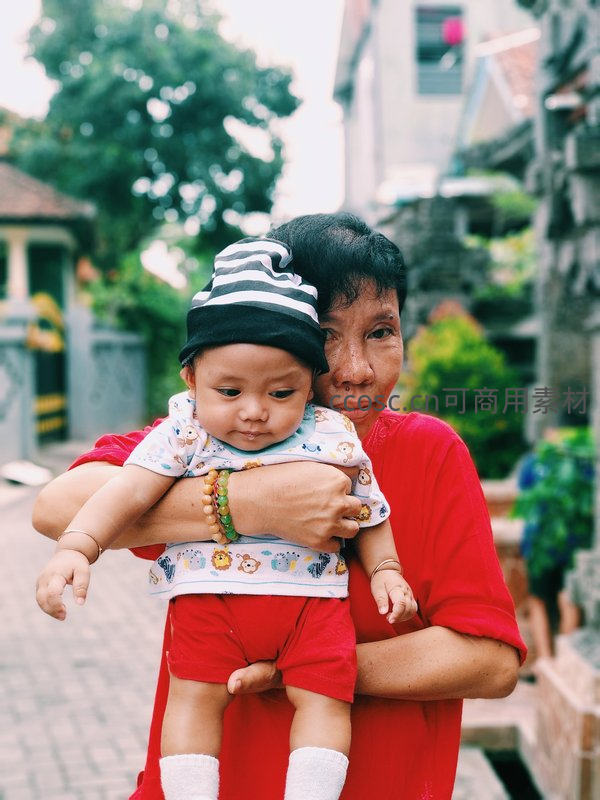 奶奶怀抱婴儿漫步古巷