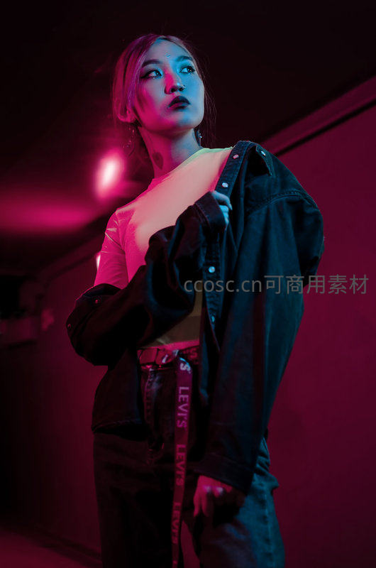 一位年轻女性在红蓝霓虹灯光下摆出酷炫姿势,身穿牛仔外套搭配潮流腰带,展现都市夜生活的前卫与个性魅力。