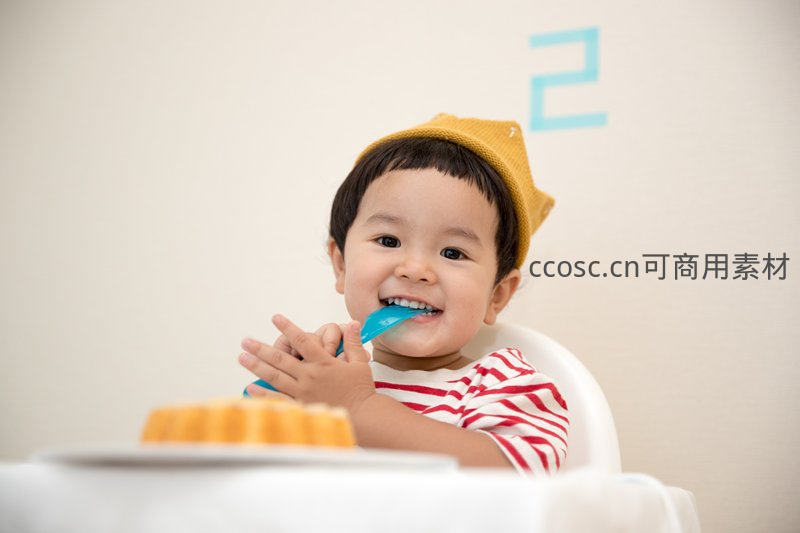 可爱小宝宝戴着黄色帽子,坐在高脚椅上用蓝色勺子吃蛋糕,笑容灿烂,充满节日气氛与童年欢乐时光。