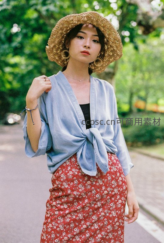 一位女子漫步在绿意盎然的林荫小道,头戴编织草帽,身着蓝衫红裙,姿态优雅从容,阳光透过树叶洒落,勾勒出清新自然的夏日午后氛围。