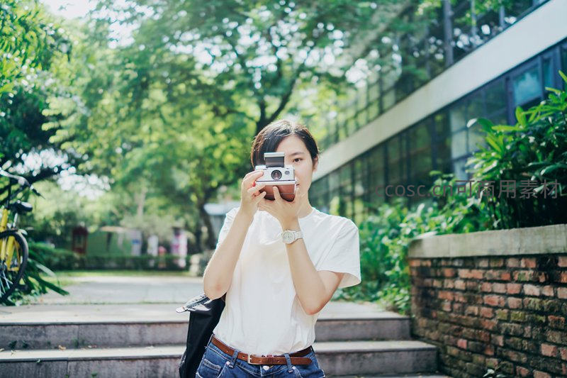 女孩站在绿意盎然的校园台阶上,手持复古宝丽来相机对准镜头,白色T恤搭配牛仔裤,充满青春活力与文艺气息。