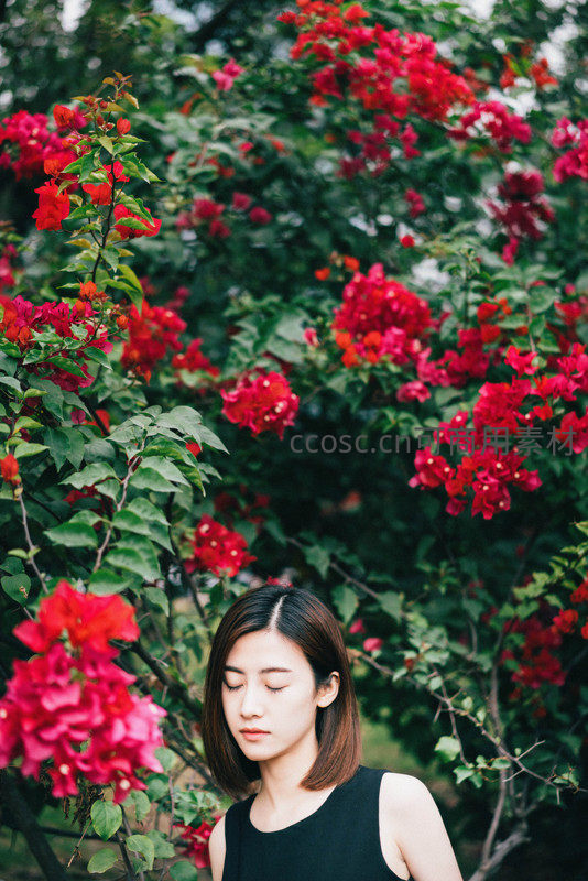 女子伫立于绚烂的红色三角梅花海前,双目轻闭,仿佛沉浸在花香与微风之中,画面充满诗意与宁静的美感。