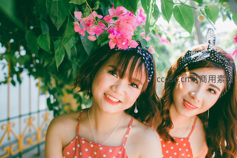 两位年轻女性在盛开的粉色三角梅下亲密合影,她们都戴着波点发带,穿着相似的吊带裙,脸上洋溢着幸福的笑容,充满夏日气息。