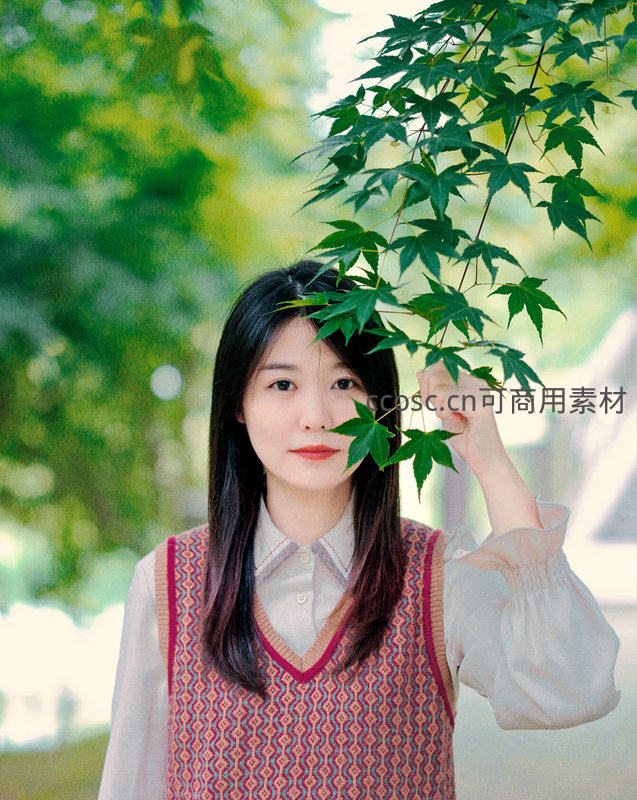 女孩在阳光斑驳的绿荫下,手轻抚枫叶,面带恬静微笑,身穿复古针织背心,营造出宁静、清新的自然氛围与文艺气息。