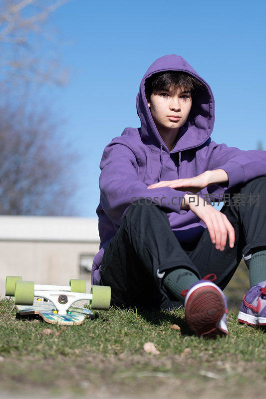 一名身穿紫色连帽卫衣的少年坐在阳光明媚的草地上,身旁放着滑板,神情专注而平静,展现了充满活力与自由气息的青春日常。