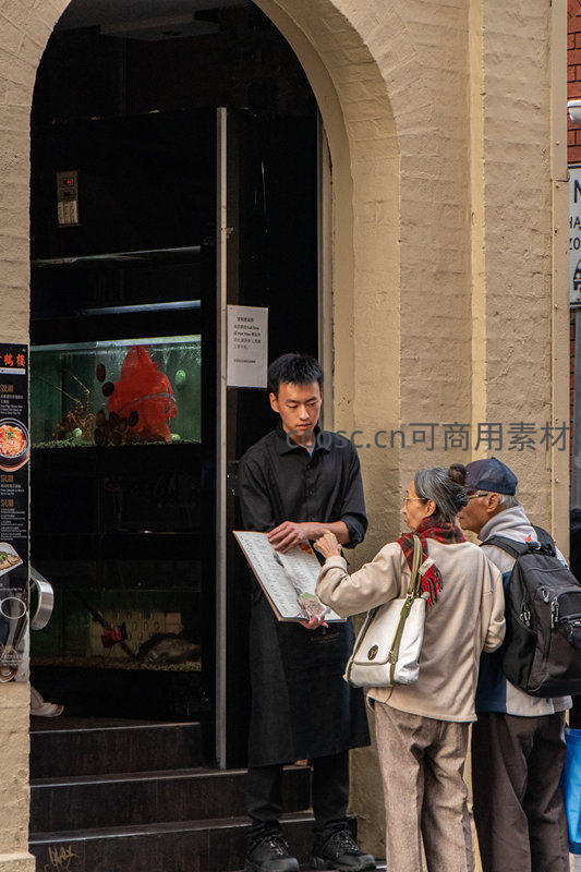 一位身穿黑色制服的服务员在餐厅门口向两位老年顾客展示菜单,背景是拱形门廊和水族箱,充满市井生活气息。
