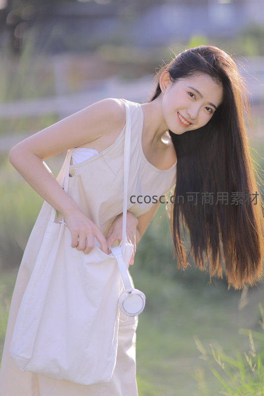 一位长发少女在户外草地上微笑回望,手提简约帆布包,阳光勾勒出她温柔轮廓,展现轻松惬意的生活瞬间。