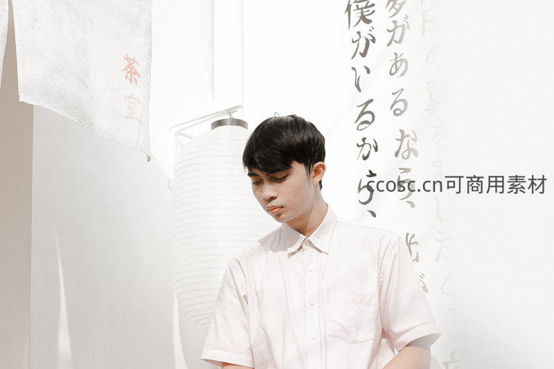 日式茶室里的沉思少年,简约背景下的文艺氛围