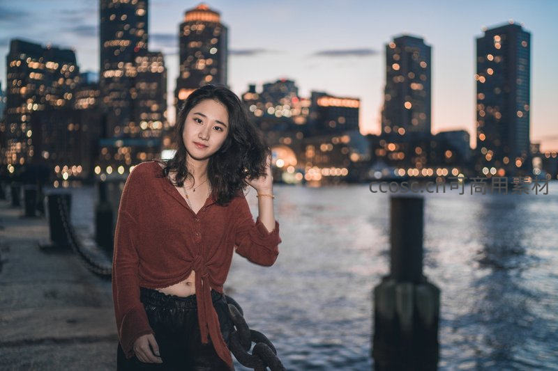 一位年轻女子站在灯火辉煌的城市水岸边,背景是模糊的摩天大楼灯光,营造出浪漫而宁静的都市夜晚氛围。