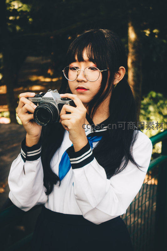 一位戴着眼镜、身穿水手服的少女正专注地举着一台老式胶片相机准备拍摄,背景是斑驳光影的树林,充满文艺与怀旧感。