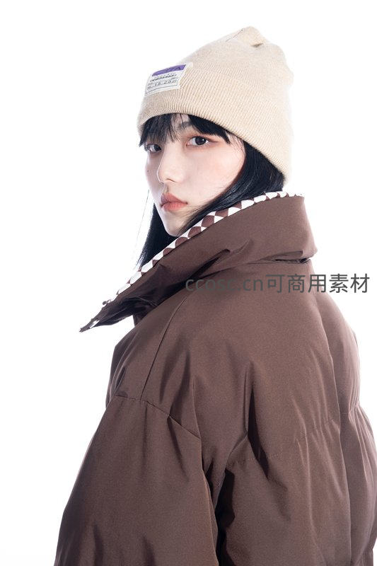 女孩身穿棕色厚外套搭配米色针织帽,侧身凝视镜头,简洁干净的背景突出服装质感与现代都市风格。