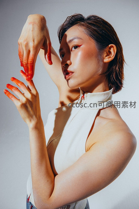 一位女性在柔和光线下摆出优雅姿势,手指沾染橙色颜料,展现出独特的艺术美感与精致妆容,传递现代美学与自我表达。
