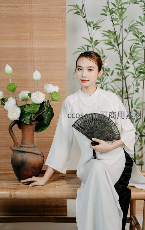 身穿素雅汉服的女子端坐于竹林旁,手执黑扇,身旁摆放盛有白莲的陶罐,营造出宁静致远、充满东方韵味的古典意境。