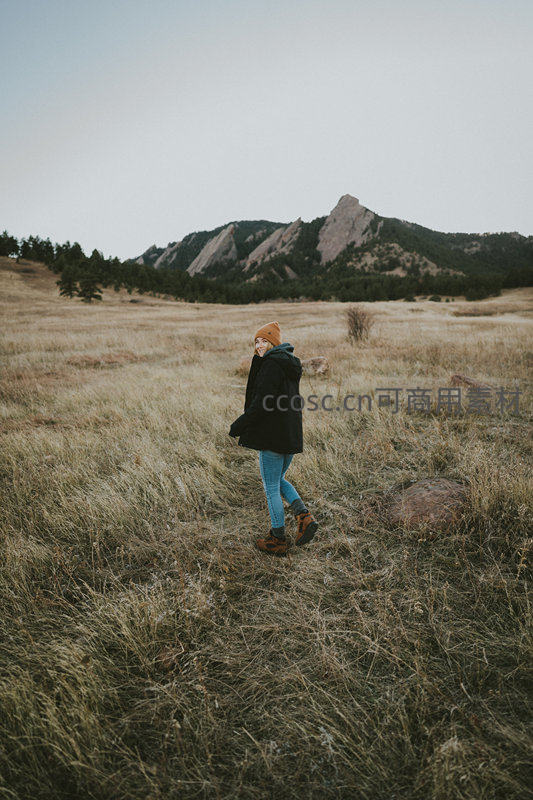 一位戴着橙色帽子、穿着黑色外套的女子在枯黄草地上行走,背景是连绵起伏的奇特山岩和苍翠树林,展现宁静而壮阔的自然之美。