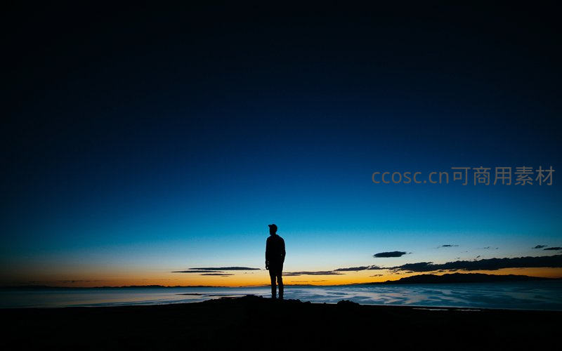 一人独自伫立在海岸高处,面对绚丽的黄昏天际线,深蓝与橙黄交织的天空下,云海翻涌,身影被勾勒成沉静而富有诗意的剪影。